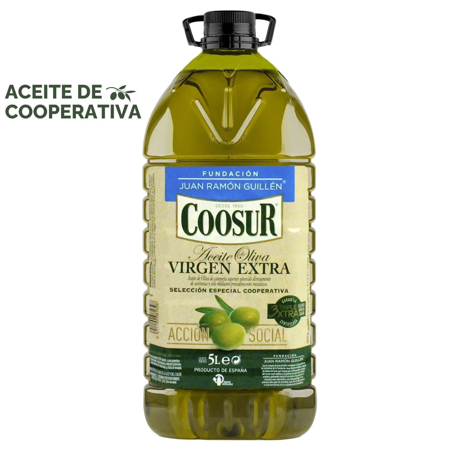 El Aceite Selección Cooperativa FJRG 5L es una excelente opción si buscas el mejor aceite de cooperativa en España. Elaborado en Jaén por cooperativas con experiencia y tradición, destaca por su sabor equilibrado, su extracción en frío y su compromiso con el entorno rural andaluz. Disponible para compra online en la tienda oficial de Coosur.