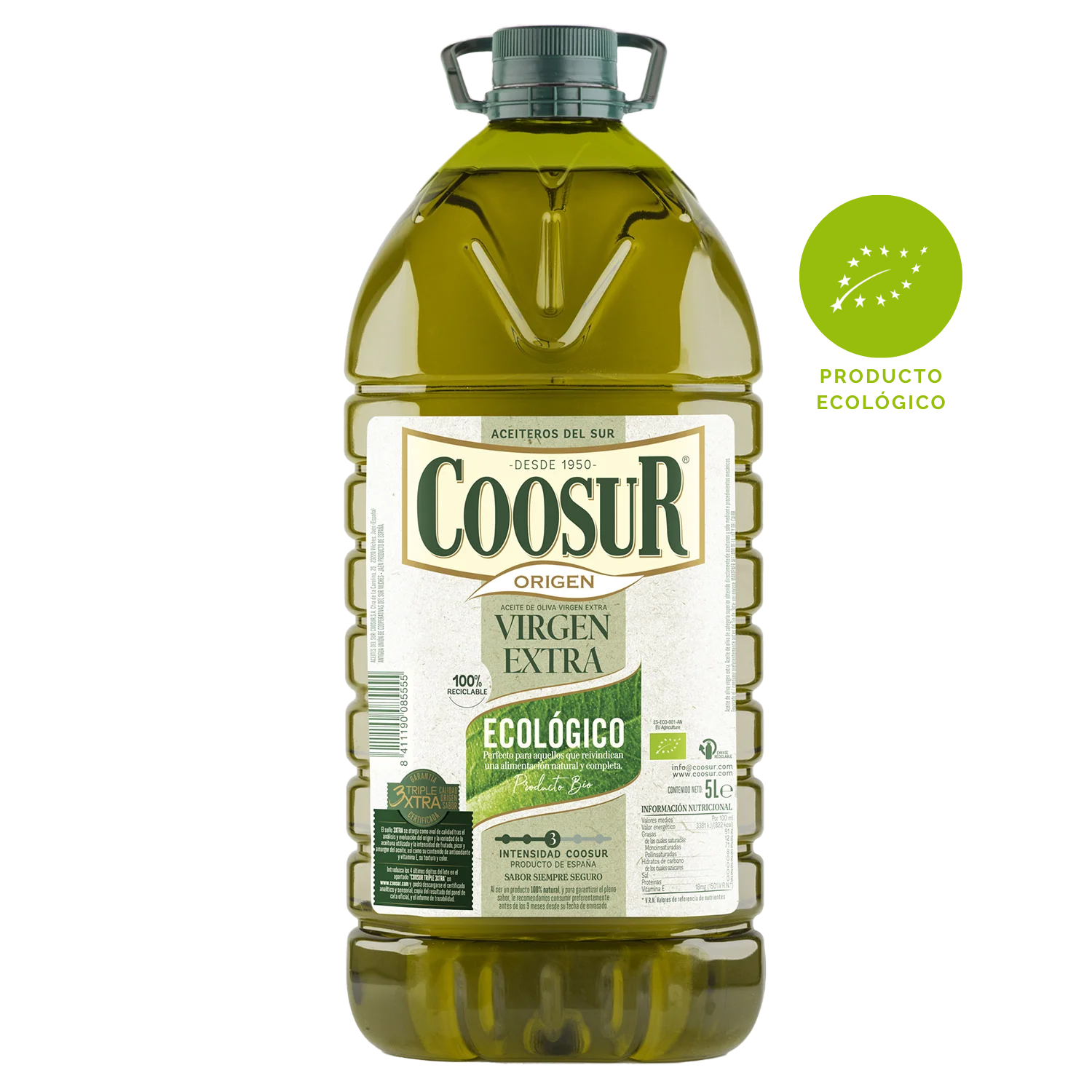 Coosur garantiza que cada gota de este aceite proviene de aceitunas cultivadas sin la utilización de productos químicos ni pesticidas, preservando así la pureza de la naturaleza en cada botella. Además, su envase de 5 litros es ideal para aquellos que no solo valoran la calidad, sino que formatos grandes que ayudan en el ahorro familiar.